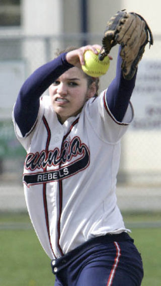 Juanita’s Kylie Sparks (No. 1) winds up a pitch during the first inning of the game against Redmond at Juanita. The Rebels (third in KingCo 4A at 11-4) won the game 1-0.