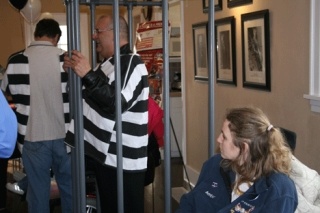 About a dozen local firefighters volunteered their time by ferrying the participants from work to the hall and back. A distinct whoop went up when Kirkland Fire & Building Chief Jeff Blake arrived for his turn in the jail. He handed his get-out-of-jail card over the to the mock judge, Tabby Stover, after raising $2,160 before the event.