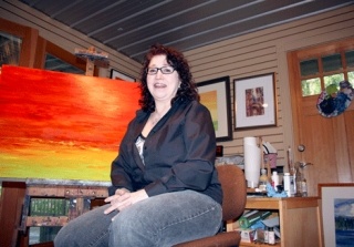 In her treehouse studio, Sharp sifts through stacks of her bright watercolor and oil paintings of scenic Northwest beaches and Marina Park, where she goes to sit by the dock and gather inspiration when it is warm.