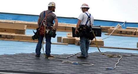 Construction workers pause for a conversation while installing the Kirkland Library's new roof. The expanded library is set to reopen in early 2010.