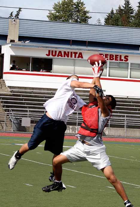 Juanita players play through a scrimmage during the first week of practices on Friday. Kirkland high schools began football preseason practice on Wednesday.