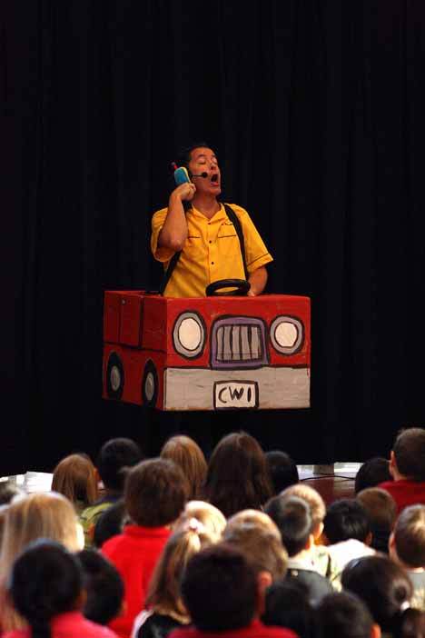 Charlie Williams, AKA ‘The Noise Guy’ entertains and a encourages students at Ben Franklin Elementary School to read on Friday. The event was apart of the Ready-Set-Read program produced by the King County Library System. The program is a part of a large effort to get 700,000 kids to read.