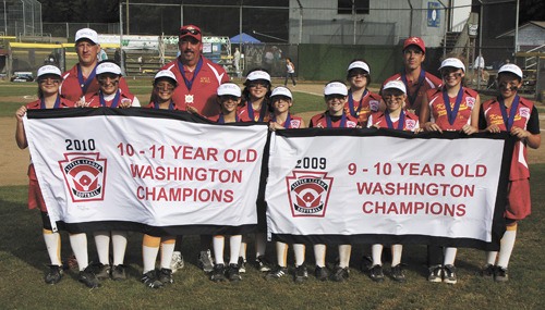 The two time state champion Kirkland National Little League team includes: Sophia Swain, Gianna Paribello, Alyxa Blackburn, Megan Murray, Tatum Kawabata, Brynn Radke, Geneva Galloway, Talia Starr, Kristina Warford, Lisa Nelson, Clare Sovacool, and coaches Bob Swain, Charlie Sovacool and manager Nolan Radke.