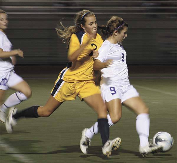 Lake Washington's Amy Johnson controls the ball as Bellevue's Emily Webb tries to steal it back during a Tuesday night conference game. The Wolverines won the game 4-1 over the Kangs.