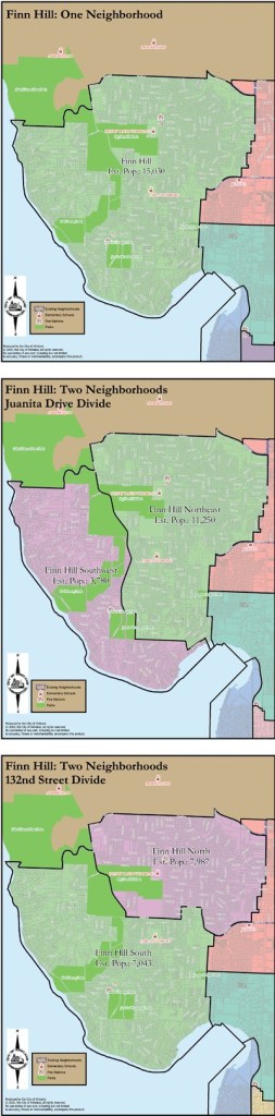 One choice is to leave the gigantic neighborhood the way it is. A second option would divide it into Finn Hill Southwest and Finn Hill Northeast primarily along Juanita Drive N.E. The second option would leave Finn Hill Southwest with 3,780 residents and Northeast with 11,250 residents.
