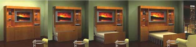 The display is a unique retractable bed system designed for efficiency and safety. Regardless of whether the space serves as a family room, craft room or media room by day, it quickly and effortlessly converts into a guest bedroom at a touch of the wireless remote.