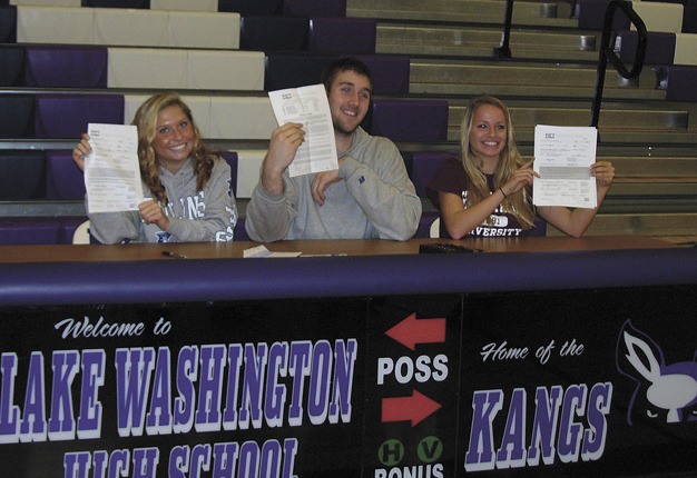 Three Lake Washington seniors officially signed their paperwork to play collegiate sports next year.