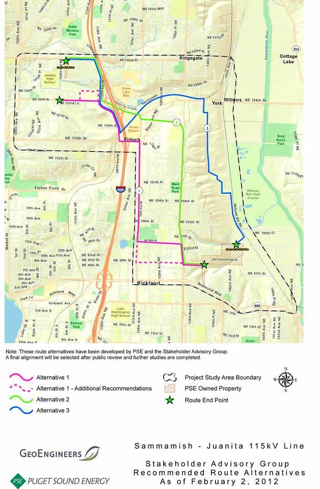 Puget Sound Energy and a project stakeholder advisory group have identified three route alternatives for the Sammamish-Juanita 115 kilovolt transmission line project.