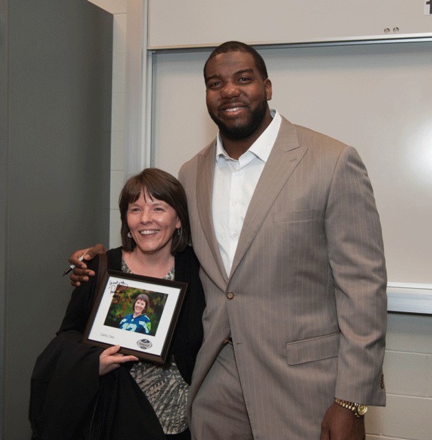 Seahawks left tackle Russell Okung was a special guest, joining the teachers and guests in the players’ locker room. Okung shared a very personal story about his fourth grade teachers Mrs. Howell and Mrs. Cook.