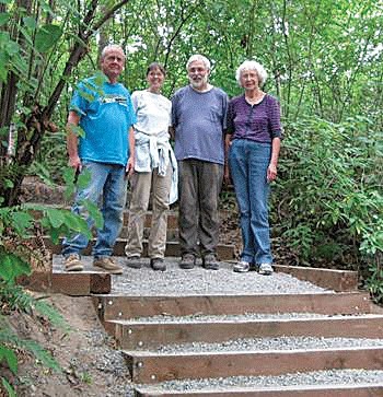 More than a dozen volunteers from five Kirkland neighborhoods worked on the 10-week project, often putting in six- to eight-hour days digging and drilling, hauling timbers and gravel, pounding rebar and cutting brush.