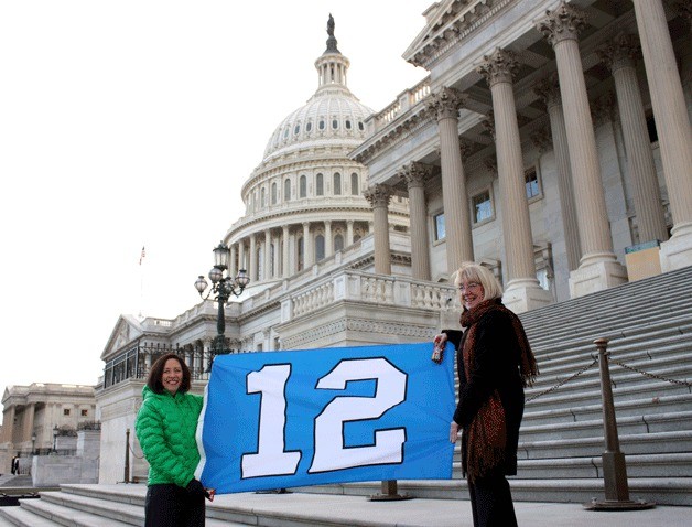 U.S. Senators Patty Murray and Maria Cantwell waved the Seattle Seahawks “12th Man” flag in front of the U.S. Capitol ahead of the team’s playoff game versus the New Orleans Saints on Saturday. The Seahawks organization has charged fans with showing their support by displaying the flag in front of various buildings or “#Hawkitecture.”