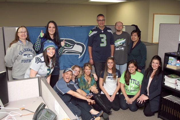 The staffs of the Kirkland, Redmond and Bothell/Kenmore Reporter newspapers show their Seahawk pride on Friday.