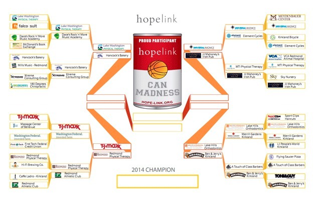 Hopelink’s fifth annual competition is patterned after the national spring college basketball tournament, matching businesses in weekly contests to see which one can bring in the most food. Teams are bracketed together in pairs and one winner from each 2-member bracket advances to the following week.