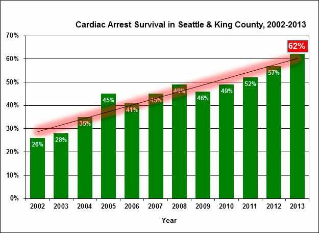 The cardiac survival rate in King County has dramatically risen over the past decade or so, from an above-average 27 percent in 2002 to 62 percent in 2013. Strategies that have contributed to the rise include:
