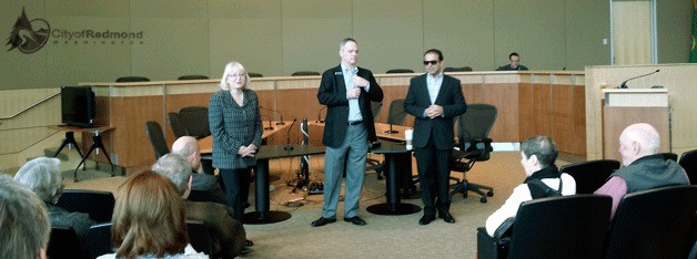 Rep.-elect Joan McBride (D-Kirkland), Rep. Ross Hunter (D-Medina) and Sen.-elect Cyrus Habib (D-Kirkland) of the 48th Legislative District discussed solving the state’s $4.4 billion budget problem at a town-hall meeting last Saturday at Redmond City Hall.