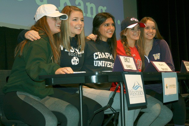 Lake Washington High School had eight students sign on to play college sports, five from the Kangs’ girls soccer team that took second place at state last season.