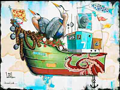 The final result evokes the industrial areas, along with the various sea life and native animals – a fishing boat suspended in mid-air flying a seal flag, with pelicans near the bow.
