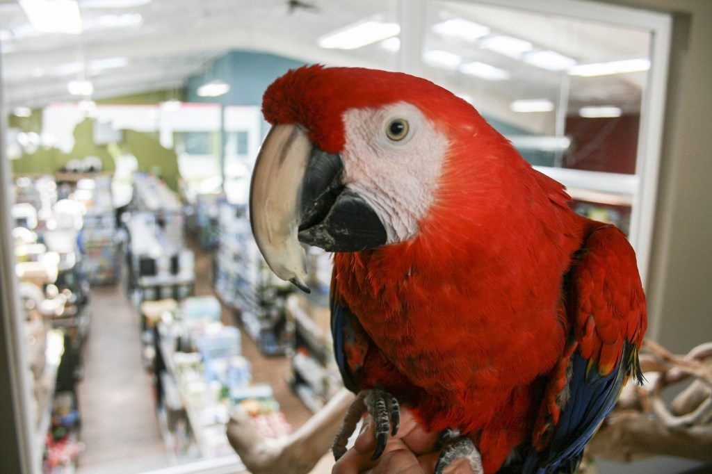 “People come in specifically to see her, and they’re like, ‘Where is she?'” said Parsons, pausing to point at Tiki’s bright red, yellow and blue feathers that peek through a window above the store’s entrance. “They come to the front counter and ask, and it’s like, ‘back up.'”