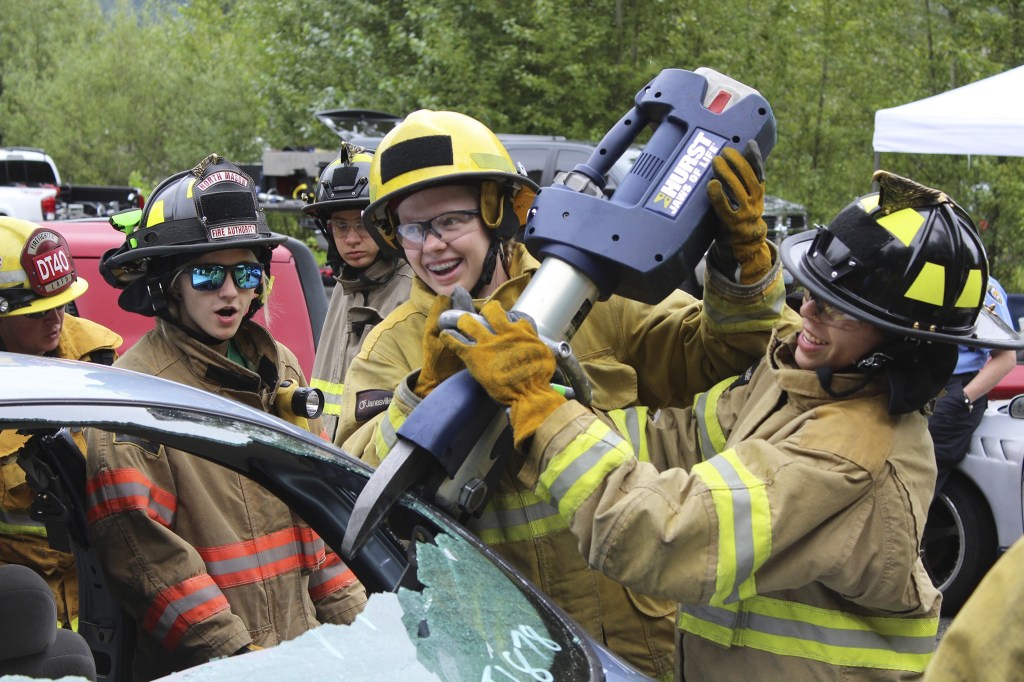 A young woman chips away at a windshield with an ax while her fellow “firefighters” use the jaws of life to pry open a car door and rescue the imaginary passenger inside. Across the way, another group was rappelling three stories down the side of the Bellevue Fire Department’s training building while three girls cheered on a teammate climbing a six-story tall ladder next to them.