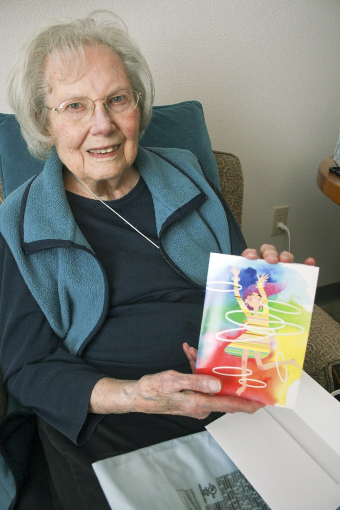 Turning to a small table to her left, Alyce Ruttkay reaches into a pocket and withdraws a card depicting a woman with both arms joyously raised above her head.