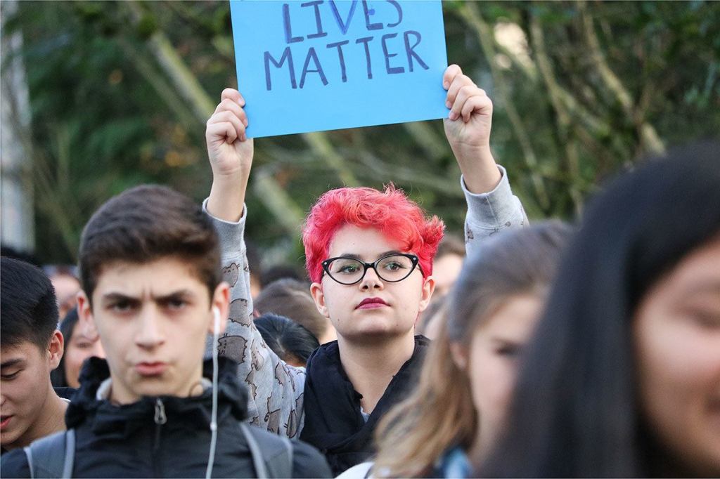 Juanita freshman Arwyn Antinoro, 14, carried a sign with the words, “Immigrant Lives Matter.”