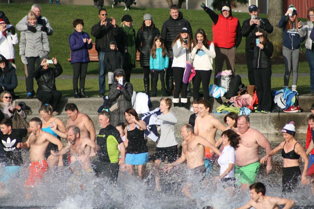 Trella and Butts were two of dozens of people who participated in the 15th annual Polar Bear Plunge on Jan. 1. The event also drew dozens of spectators to watch what participant Carol Schultz of Redmond called the “insanity.”