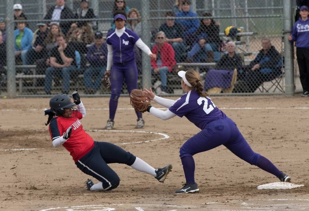 Juanita’s Sasha Mitchell is thrown out advancing to second on Friday. Lake Washington’s Anna Robinson is at second base and LW’s Marissa Ewald is in the background. LW won, 13-2, and was backed by homers by Jamie Pippin and Anna Robinson. Brynn Radke had three hits for Juanita. Courtesy of Eric Chen