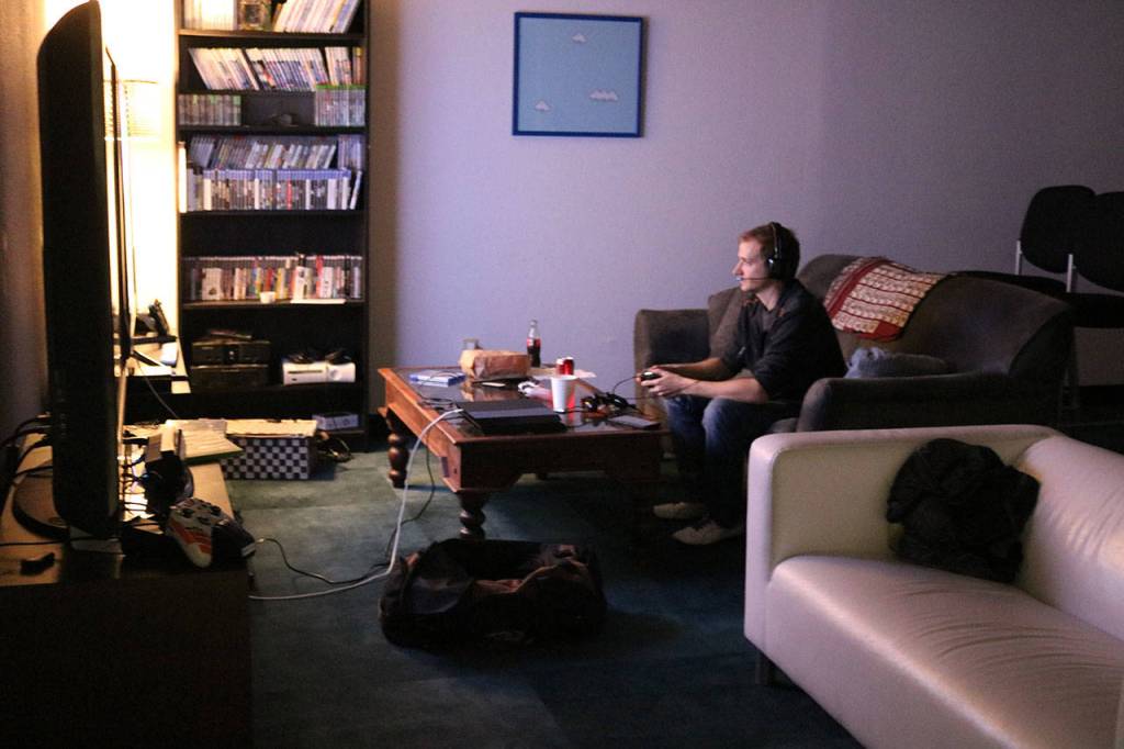 A Verne & Wells member uses the club’s screening room to play a video game. CATHERINE KRUMMEY / Kirkland Reporter