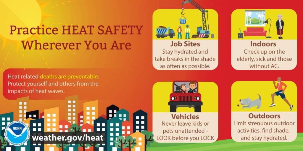 The National Weather Service advises everyone to drink plenty of fluids and avoid strenuous activities; avoid the sun and seek share; stay in air-conditioned areas; check on relatives and neighbors who might be susceptible to heat-related illnesses; don’t leave children, elderly, disabled persons or pets in a hot car; and make sure outdoor pets have shelter from the sun and plenty of water to drink.