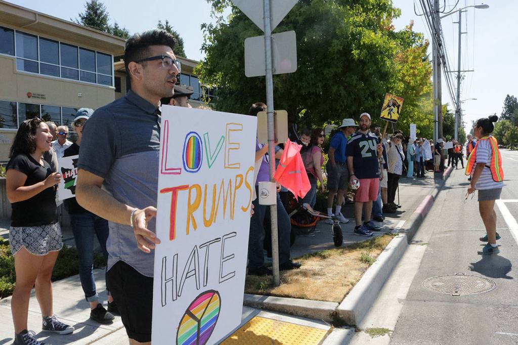 A demonstrator holds up his sign for love at last Saturday’s march and rally in front of Google in Kirkland. Samantha Pak, Kirkland Reporter