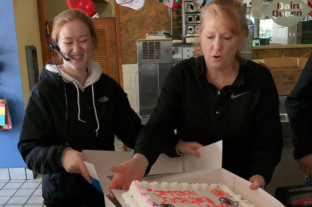 Kristine Ott alongside her daughter, Kalie, boxes the final cake sold at the Bridle Trails Dairy Queen. Kailan Manandic, Kirkland Reporter