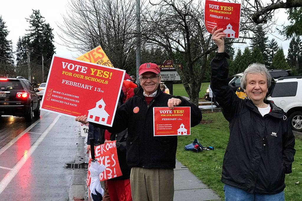 “It’s really to make people aware, because the most important thing they can do is vote,” said Martha Deamicis, a Lake Washington Citizens Levy Committee member. “We need people to vote ‘yes’ to support our schools and we’re out here in the rain, wearing red to make sure that people remember to do that and to remember how important it is for our community.”