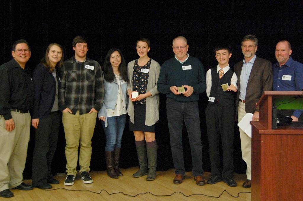 Pedestrian flag steward and parks volunteer Kobey Chew, Green Kirkland Partnership volunteer Norm McKinley, community center volunteer Gail Schaeffer and UW-REN students Audrey, Sam, Elise, Bryan, Alec, Jason and Beth received the Above and Beyond the Call of Duty award.