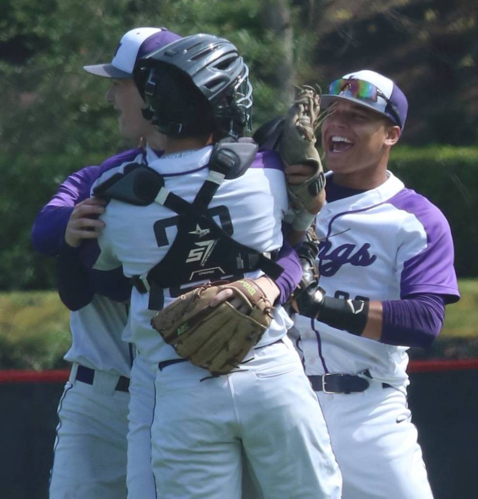 Oliver Laufman hugs catcher Jesus Vizcarra as Torin Montgomery joins the celebration after the final out. Andy Nystrom / staff photo