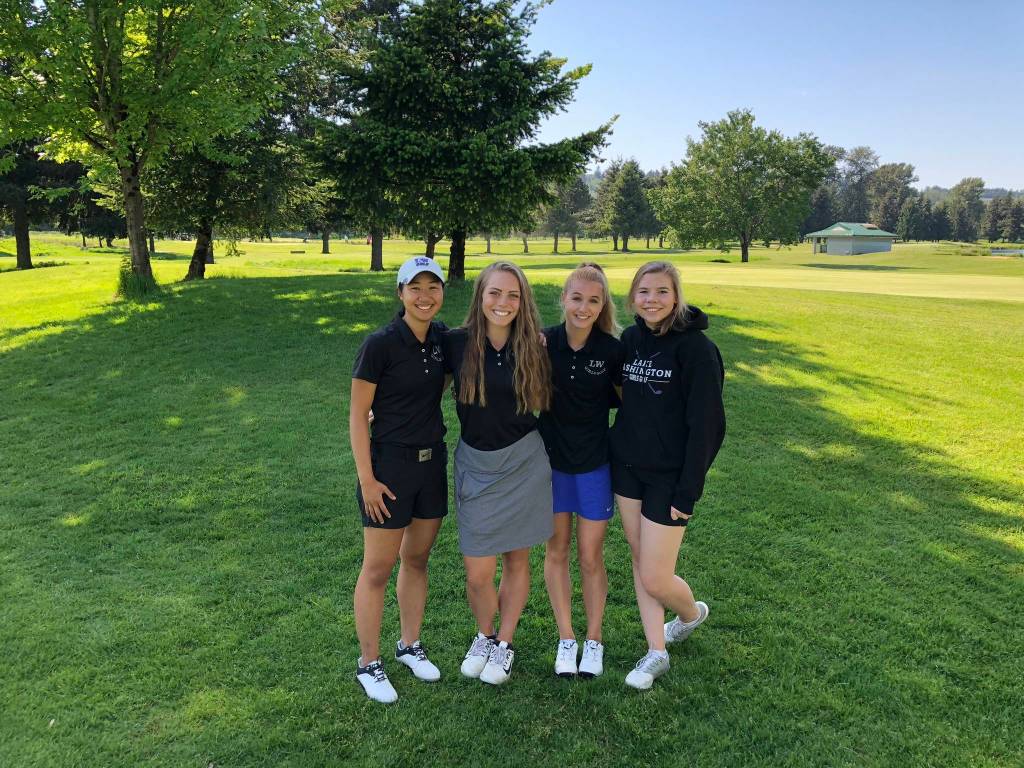 Lake Washington’s Kaitlyn Uhrich and Molly Behrends qualified for state with their performances at the 3A SeaKing District tournament on Tuesday at Riverbend Golf Course in Kent. Uhrich tied for 18th with an 88 and Behrends took 21st with an 89. The two Kangs will travel to Spokane for the May 22-23 premier event at Indian Canyon Golf Course. Pictured from left at districts are LW’s Behrends, Makena Pluth, Uhrich and Grace Hawkins. Courtesy photo