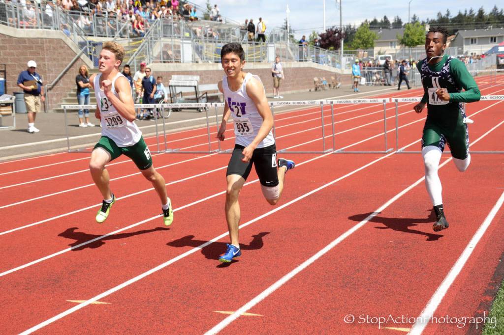 Photo courtesy of Don Borin/Stop Action Photography                                Lake Washington Kangaroos senior Xavier Betancourt, center, earned sixth place with a time of 40.43 in the 300 hurdles at the Class 3A state track meet on May 26 at Mount Tahoma High School in Tacoma.
