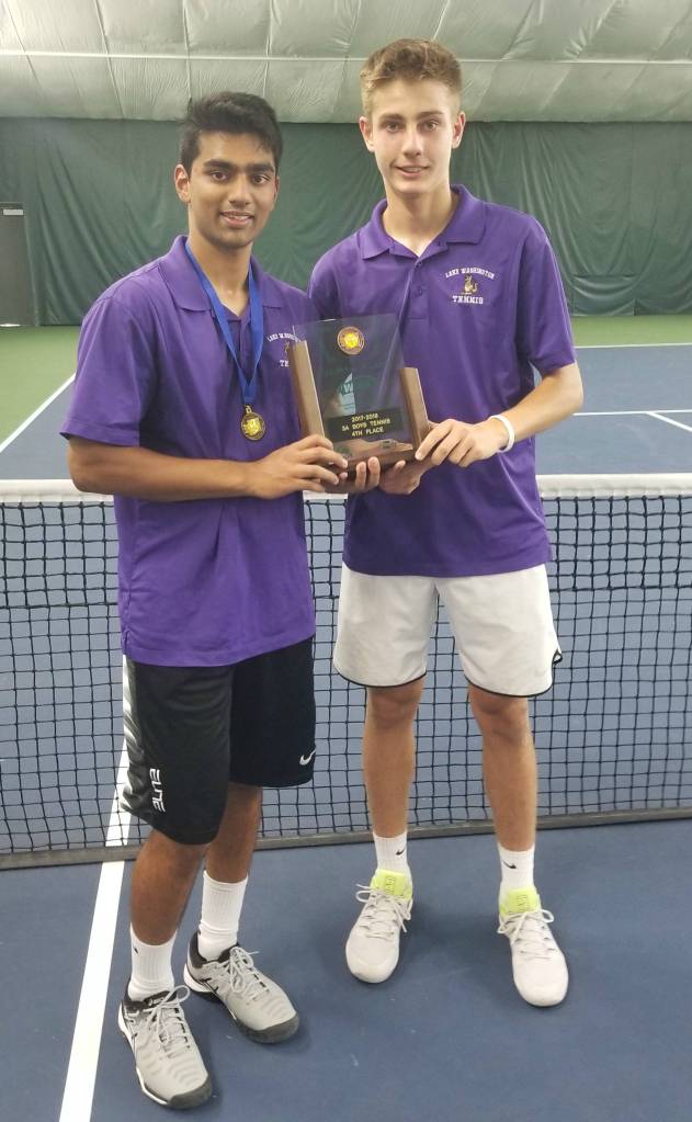Lake Washington’s boys doubles tennis team of Shubhu Purohit/Nedim Suko (pictured) beat Michael Campbell/Thomas Sui of North Thurston, 6-4, 4-6, 6-2, to win the 3A state title last month in Kennewick. LW’s Charlize Yeh captured fourth place in the state singles tournament. In the team standings, LW’s boys placed fourth and the girls placed tied for fifth. Photo courtesy of Bhanu Purohit