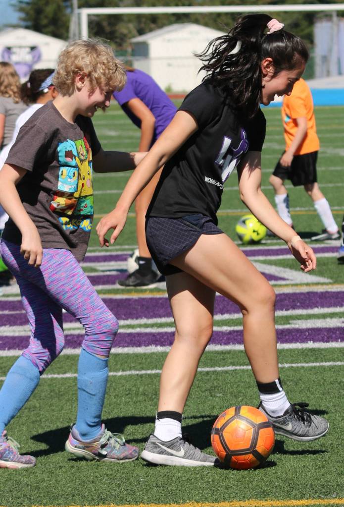 Top photo, Lake Washington High senior-to-be Taryn Chisholm, right, has a blast with Lil’ Kangs Soccer Camp youngster Helen Wele on July 12. The camp was for boys and girls ages 6-12 of all levels. Skills covered during the camp, with instruction by Kang players and coaches, included passing and receiving, dribbling and fun moves, shooting, agility, mini tournaments for game-like experience and more. Andy Nystrom / staff photo
