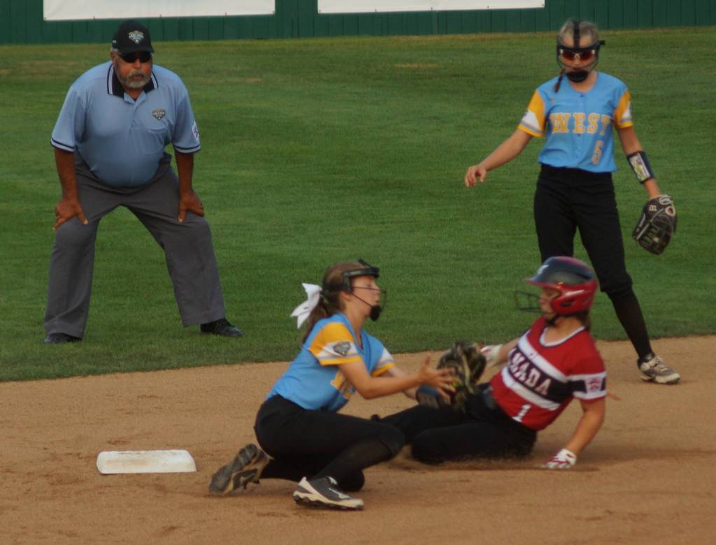 Front photo: Christina Minor makes a play at second as Bella Ely stands by. Courtesy of workmac-LLSWS