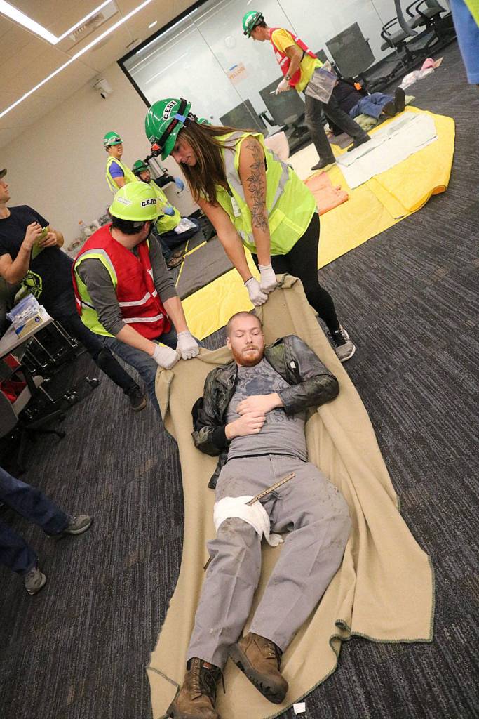 CERT members carry a survivor of a major earthquake to the medical area during a disaster drill in Kirkland City Hall Saturday. Megan Campbell/Kirkland Reporter