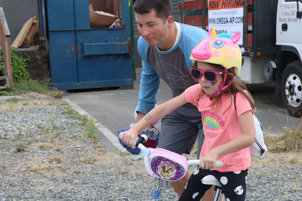 A young girl gets a boost while riding her bike along the Cross Kirkland Corridor. Katie Metzger/staff photo