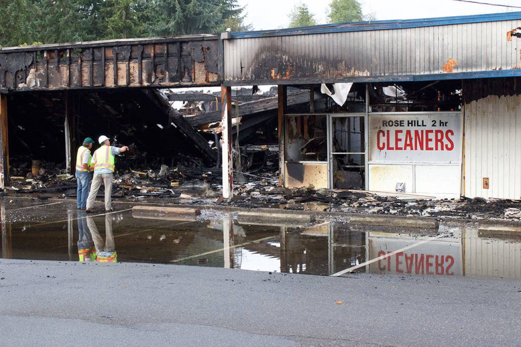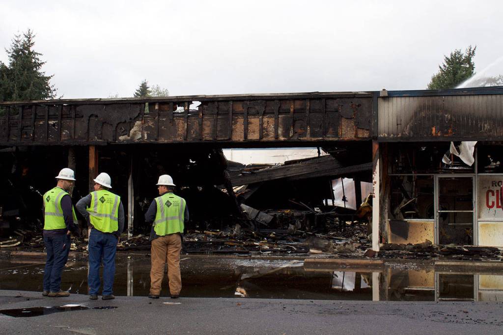 Kirkland firefighters and Puget Sound Energy staff examine the aftermath of a four-hour fire that destroyed the Rose Hill Village. Kailan Manandic/staff photo