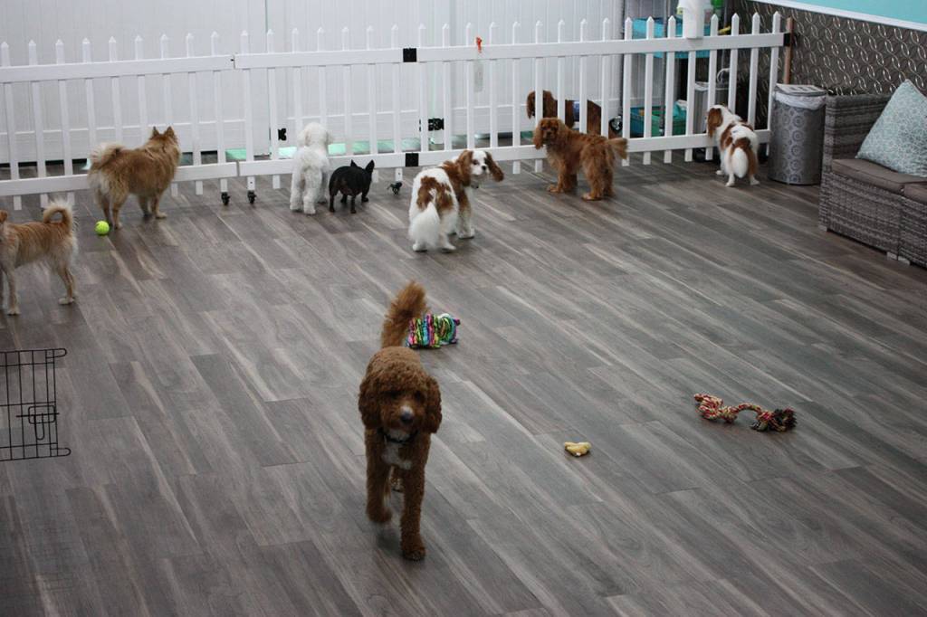 The dogs are separated into two groups: those with lots of energy and those that are more reserved to better take care of them during the day. Couches are provided as are resting zones where playing isn’t allowed, and the facility has a fenced outdoor deck area for fresh air. The daycare accepts dogs up to 20 inches in height and does not have weight requirements.