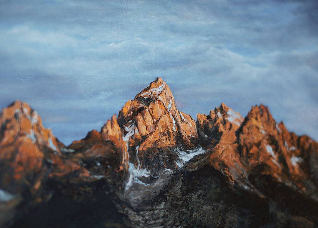 Dmitruk first contacts a photographer to collaborate and then depending on the mood of the photo, deliberates the technique and process. Palette knife work, which she uses in “Grand Teton,” is a much quicker technique than brush work. Palette knife work involves more texture and color. She specifically used this style to bring out the edgy textures of the mountains. Dmitruk will use brush work on portraits of people and animals. The style helps recreate the softness and delicacy of the subject.