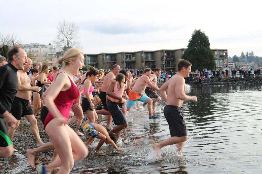 Hundreds of Kirklanders rang in the New Year by taking a plunge at the Polar Bear Plunge at Kirkland’s Marina Park. The 17th annual event brought together residents as they braved the cold to ring in the New Year. The unofficial event has become a yearly tradition where attendees jump into Lake Washington. Stephanie Quiroz/staff photos