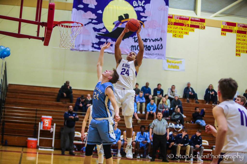 Lake Washington Kangaroos senior Torin Montgomery, right, leaps for a rebound against the Interlake Saints in a loser-out playoff game on Feb. 6 at Newport High School in Factoria. Interlake defeated Lake Washington 51-50. Photo courtesy of Don Borin/Stop Action Photography