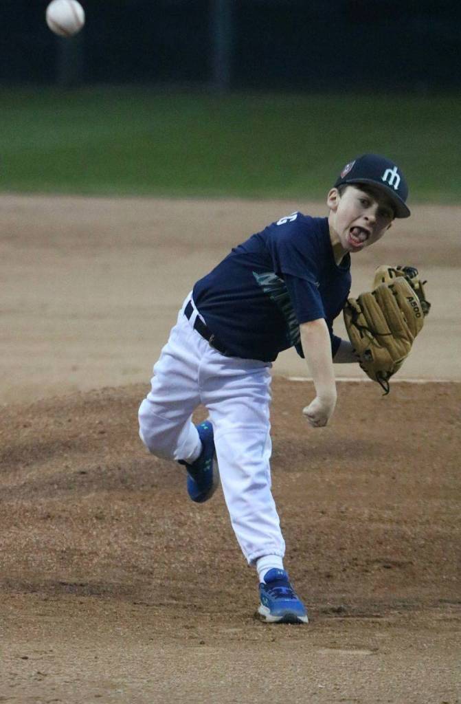 Kirkland Little Leaguer Brayden Greenberg, 9, throws out one of the first pitches before the Lake Washington and Juanita varsity baseball game on Friday night at Lee Johnson Field. Lake Washington School District Deputy Superintendent Jon Holmen threw out the other pitch. Andy Nystrom / staff photo