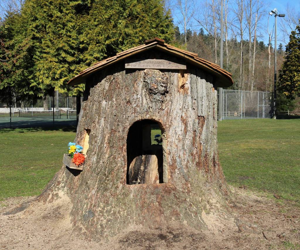 The roughly six-foot-tall stump is perched in the park’s grassy field on the north side of Northeast Juanita Drive directly east of the tennis courts. The diminutive dwelling is suitable for all species of stubby stature, featuring a doorway, windows and even a tiny cedar shake roof, according to a city press release. Parks staff put the finishing touches on the structure on March 15, adding brightly colored flower-festooned window boxes and a placard proclaiming the stump “Ryug Frostinson’s home for fairies, elves and gnomes.”