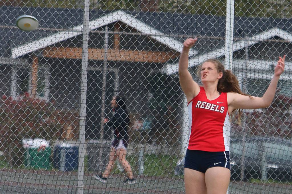 Juanita High junior Julia Ryan unleashes the discus on April 3. She stands first in 3A KingCo and District 2 with a mark of 114 feet, 1 inch. Andy Nystrom / staff photo