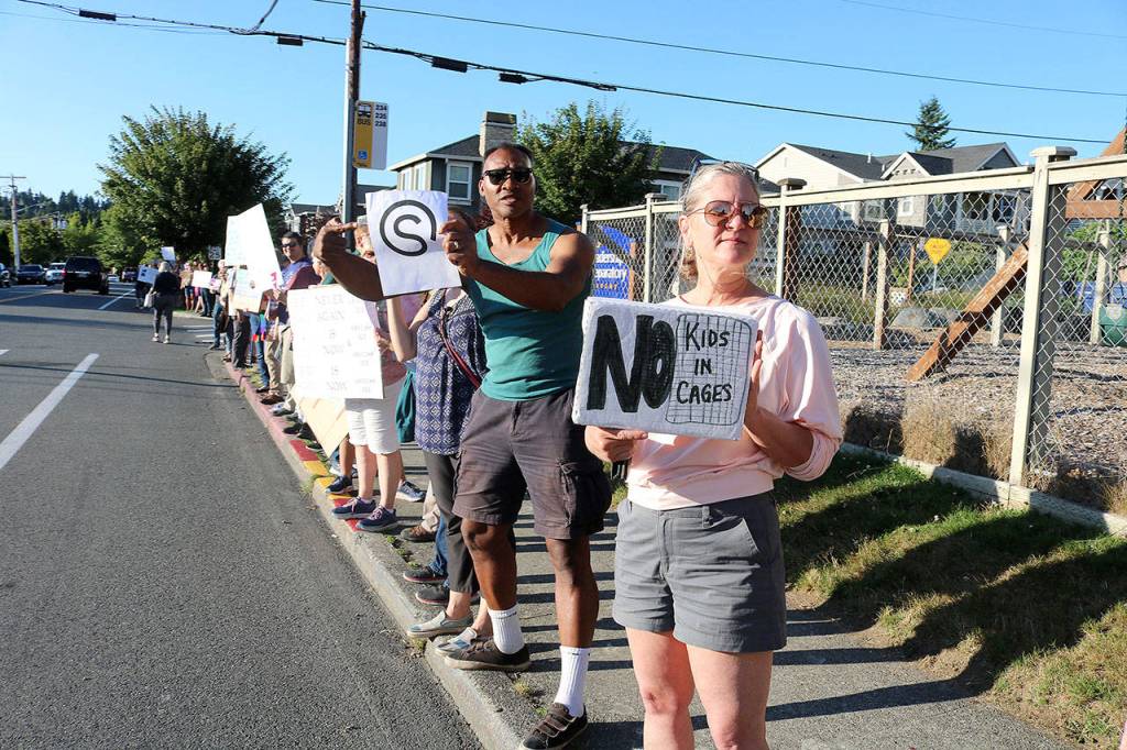More than 50 members of the Kol Ami congregation gathered at Northlake Unitarian Universalist Church in Kirkland on July 12 to protest the border detention camps in one of the hundreds of Lights for Liberty Vigils.